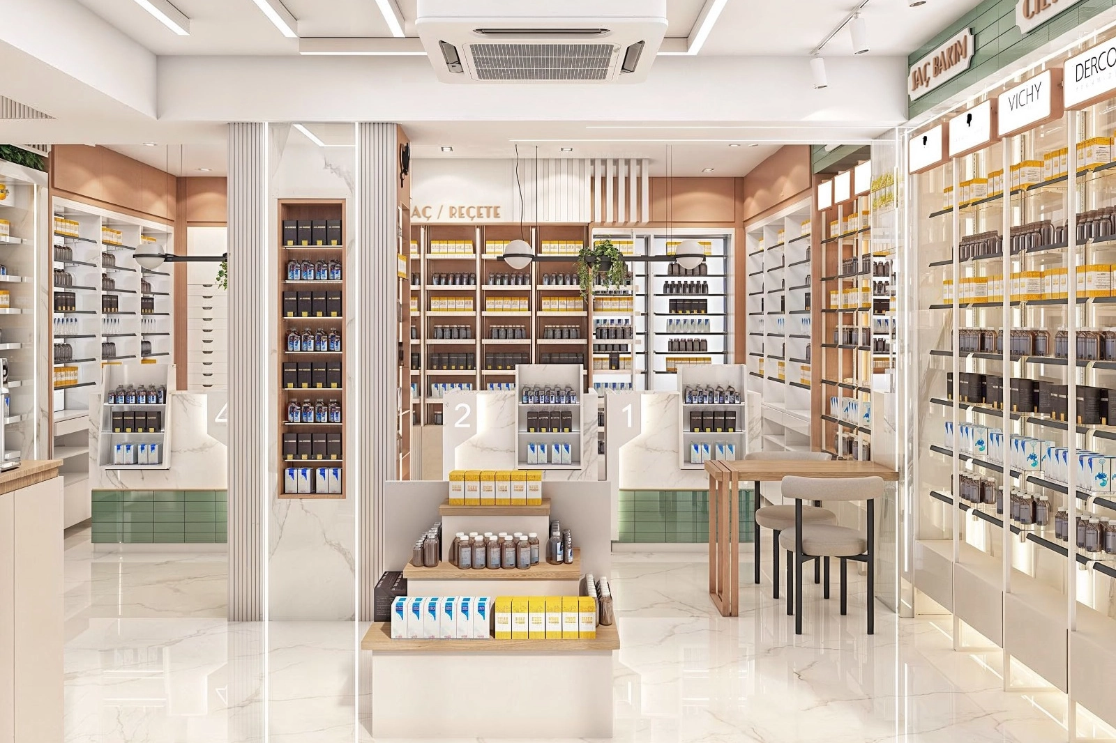 Mekânın aydınlatması, renk seçimi ve genel düzeni ilk izlenimi belirler. Ferah ve dengeli bir tasarım, sağlık sektöründe olması gereken profesyonel algıyı güçlendirir. Bununla birlikte raf sistemlerinin planlı yerleşimi ve danışma alanının doğru konumlandırılması hem müşteri akışını hem de satış performansını etkiler.