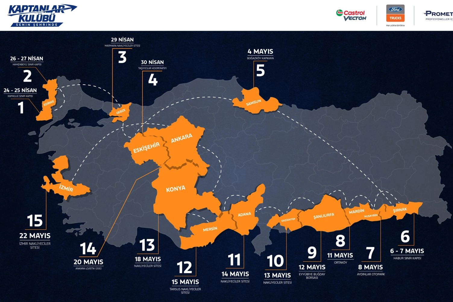 Ford Trucks, Castrol ve Prometeon’un hayata geçirdiği “Kaptanlar Kulübü Senin Şehrinde” etkinliğinin detaylı takvimine göre roadshow 24 Nisan’da Edirne Kapıkule Sınır Kapısı’nda başlayacak ve 22 Mayıs’ta İzmir Nakliyeciler Sitesi’nde sona erecek.