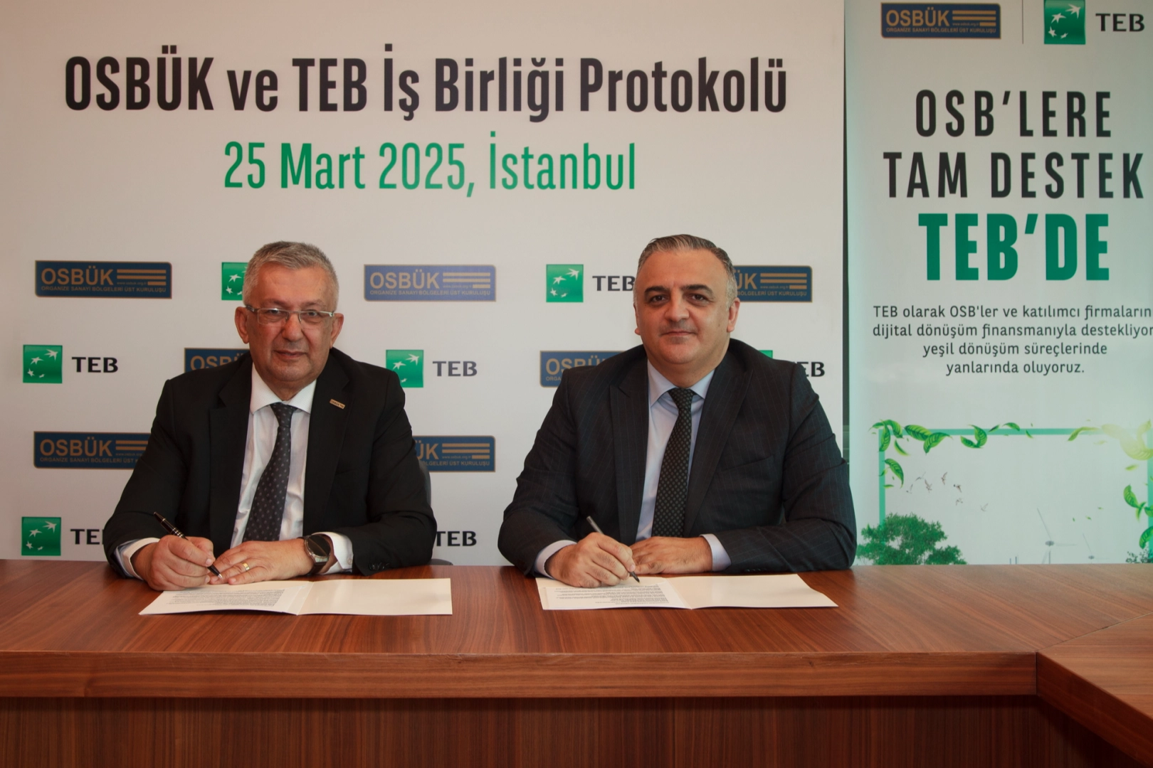 Orta ve uzun vadeli finansmanları çeşitlendirme stratejisiyle uygun maliyetli kaynak sağlayan TEB, müşterilerinin sürdürülebilirlik kapsamındaki proje ve yatırımlarına ihtiyaç duydukları finansman desteğini sunmayı sürdürüyor. OSBÜK Yönetim Kurulu Üyesi Mustafa R. Türker ile TEB KOBİ Bankacılığı Pazarlama ve İş Geliştirme Direktörü Atilla Derman tarafından imzalanan TEB ve OSBÜK iş birliği protokolüyle, Türkiye sanayisinin yeşil ve dijital dönüşümüne katkı sağlanması ve organize sanayi bölgelerindeki firmaların sürdürülebilir büyümesinin desteklenmesi amaçlanıyor.