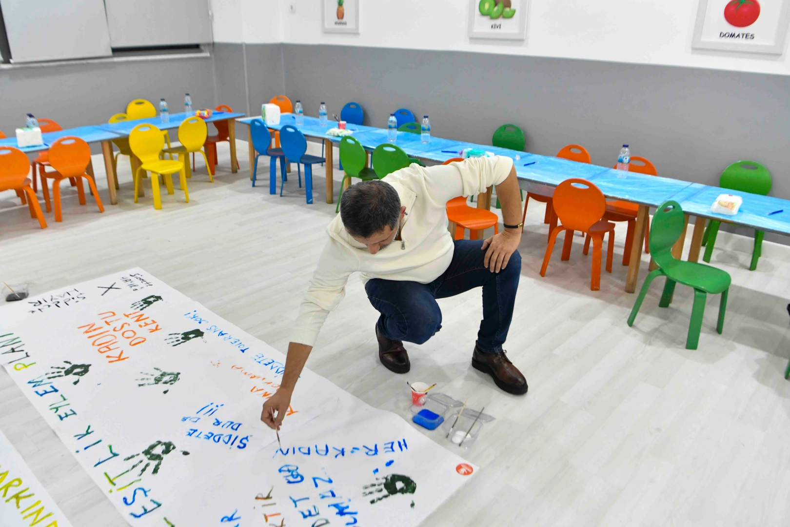 Osmanlı Çocuk Etkinlik Merkezi’nde ise 3-6 yaş grubu çocukların babalarına yönelik bir farkındalık programı düzenlendi. Toplumsal cinsiyet eşitliği ve kadına karşı şiddetin önlenmesi üzerine yapılan bilgilendirmelerin ardından, erkek veliler beyaz branda üzerine renkli boyalarla sloganlar yazarak şiddete karşı dayanışma mesajları verdi.