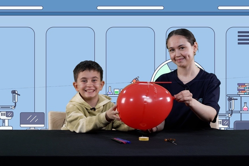 Balon, pipet ve ip ile roket yapılan bu çalışmada balondan çıkan hava sayesinde roket ileri gidiyor. Böylece Newton’un “Her etkiye karşılık, eşit ve zıt yönlü bir tepki vardır” ilkesini ve roketlerin çalışma prensibi eğlenceli bir şekilde öğreniliyor. Uzun bir ip, pipet, balon, bant, roketi süslemek için renkli kağıtlar veya keçeli kalemlerin kullanıldığı bu deney, hareket ve kuvvet kavramlarını çocukların somut olarak gözlemlemesini sağlıyor.