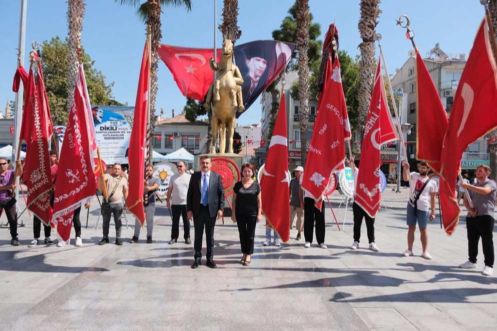 Dikili Atatürk Meydanı’nda gerçekleşen resmi kutlama programına Dikili Kaymakamı Cevat Gün, Dikili Belediye Başkanı Adil Kırgöz, Cumhuriyet Başsavcısı Mehmet Akif İpek, gaziler, kamu kurum müdürleri, daire amirleri, belediye meclis üyeleri, meslek odaları, sivil toplum kuruluşları, siyasi partiler ve çok sayıda vatandaş katıldı. Çelenk sunumu ve Dikili Belediyesi Halk Oyunları Topluluğu’nun zeybek gösterileri sonrasında Şehit Sami Akbulut Caddesi’nde geçit töreni gerçekleştirildi.