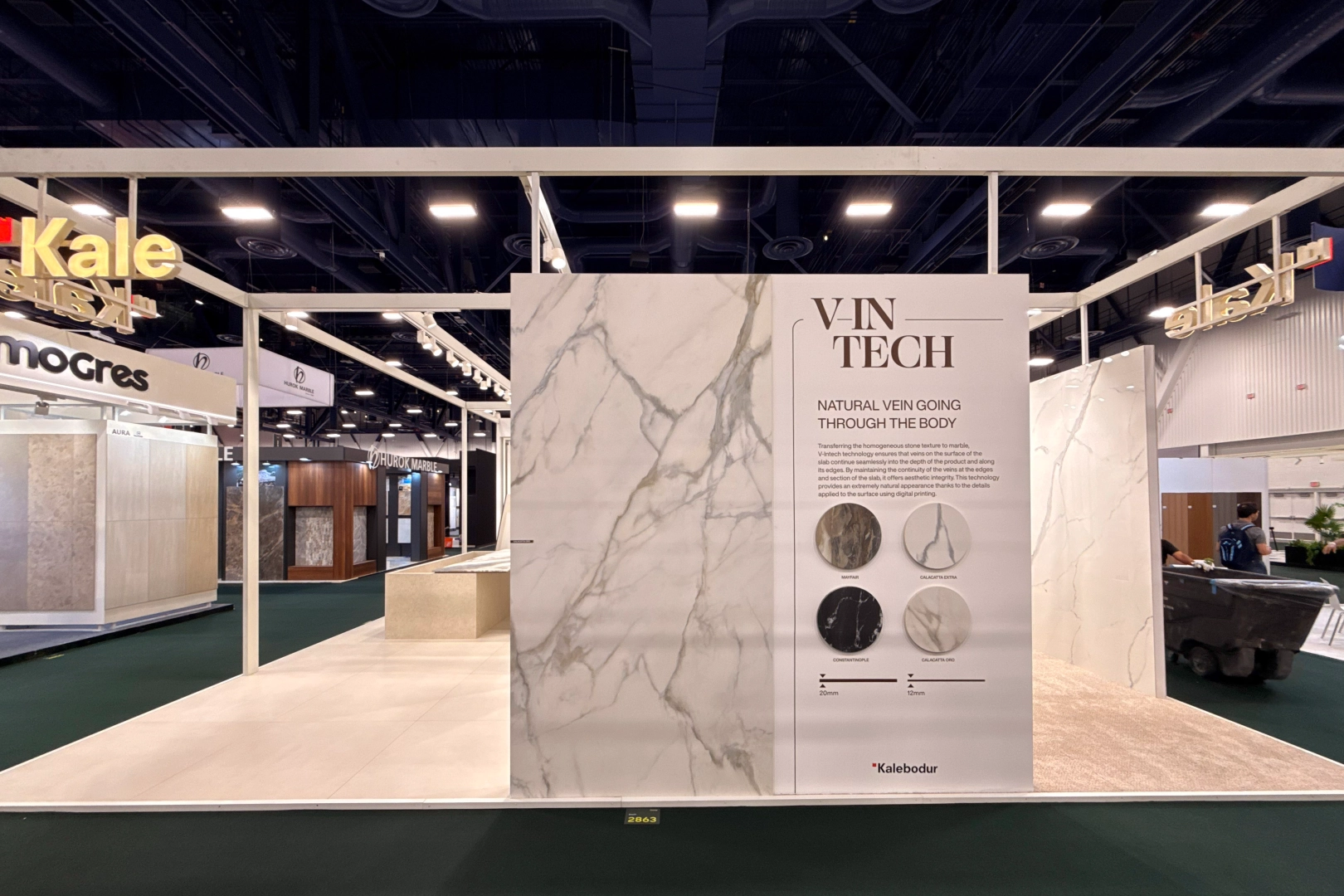Kalebodur'un 7 farklı üstün yüzey teknolojisinden biri olan V-Intech, fuar boyunca ziyaretçilerden büyük ilgi gördü. Bu teknoloji, doğal taşın homojen dokusunu ve mermerin ikonik damar sürekliliğini yalnızca yüzeyde değil, porselen plakanın gövdesi boyunca da koruyarak kesim ve kenar detaylarında görsel süreklilik sunuyor. Tezgâh ve mobilya gibi detay işçiliği gerektiren uygulamalarda kusursuz bir bütünlük sağlayan V-Intech, mimarlara sınırları ortadan kaldıran tasarım özgürlüğü kazandırmasıyla ön plana çıktı.