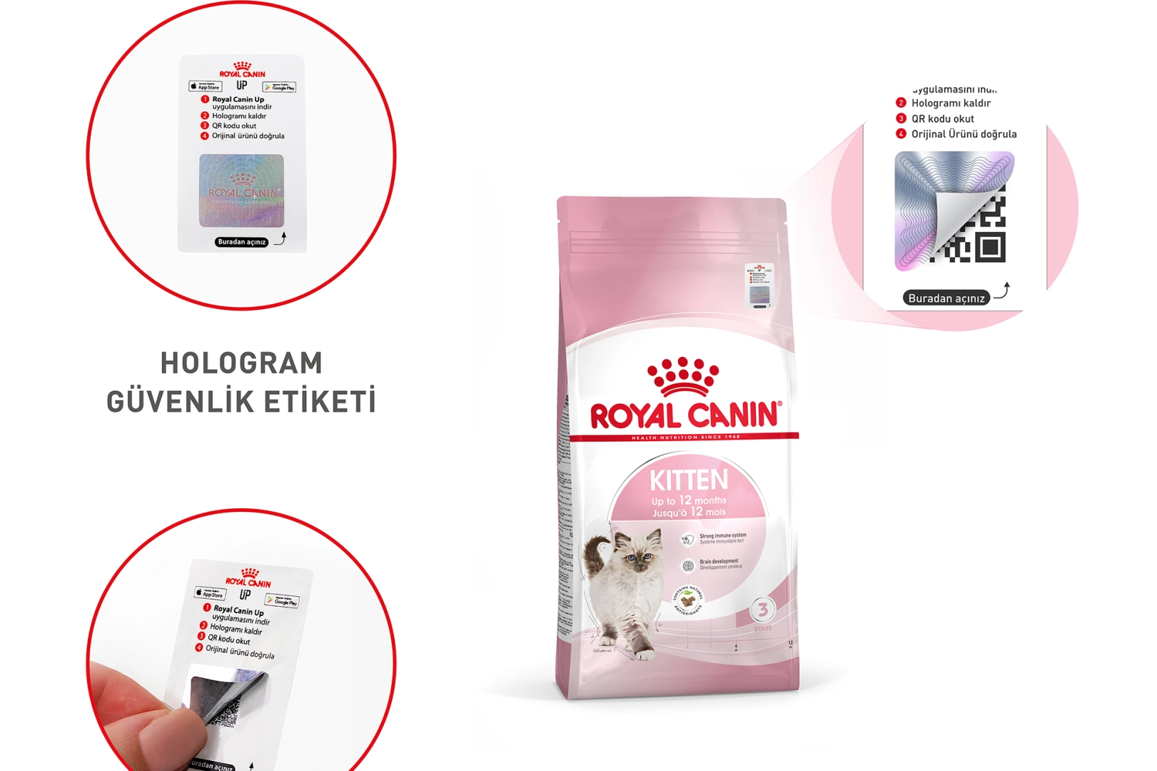 Mama sektöründe bir ilke imza atan Royal Canin Türkiye, ülkemizde ilk kez kuru mama ambalajlarında hologramlı QR kod ile ürün doğrulama sistemini devreye aldı. Bu yenilik sayesinde hayvan sahipleri, satın aldıkları ürünün orijinalliğini, satın alma işleminin ardından, ambalaj üzerindeki hologramlı QR kodu Royal Canin Up mobil uygulaması ile tarayarak anında teyit edebilecekler; böylece gönül rahatlığıyla güvenli, kaliteli ve orijinal mamayla besleme yapabilecekler.