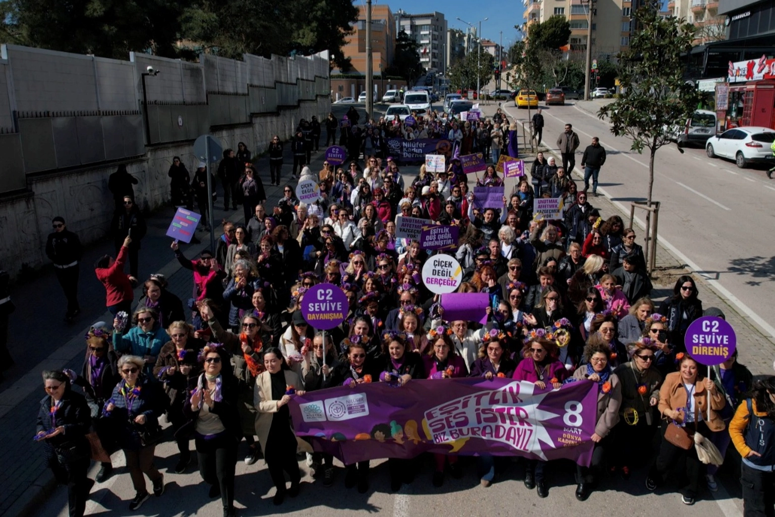 Nilüfer Belediyesi ve Nilüfer Kent Konseyi, 8 Mart Dünya Kadınlar Günü’nde geniş katılımlı bir yürüyüş ve basın açıklaması düzenledi. “Eşitlik Ses İster, Biz Buradayız” sloganıyla Nilüfer Kent Konseyi önünde başlayan yürüyüşte kadınlar, eşitlik ve direniş sloganları eşliğinde Nilüfer Belediyesi Halk Evi önündeki Cumhuriyet Meydanı’na kadar yürüdü. Etkinliğe, Nilüfer Belediye Başkan Yardımcıları Serpil Altun ve Bukle Erman ve meclis üyeleri ile Nilüfer Belediye Başkanı Şadi Özdemir’in eşi Nuray Özdemir de katıldı. Korteje, Nilüfer Kent Konseyi Bisiklet Çalışma Grubu da bisikletleriyle eşlik etti.