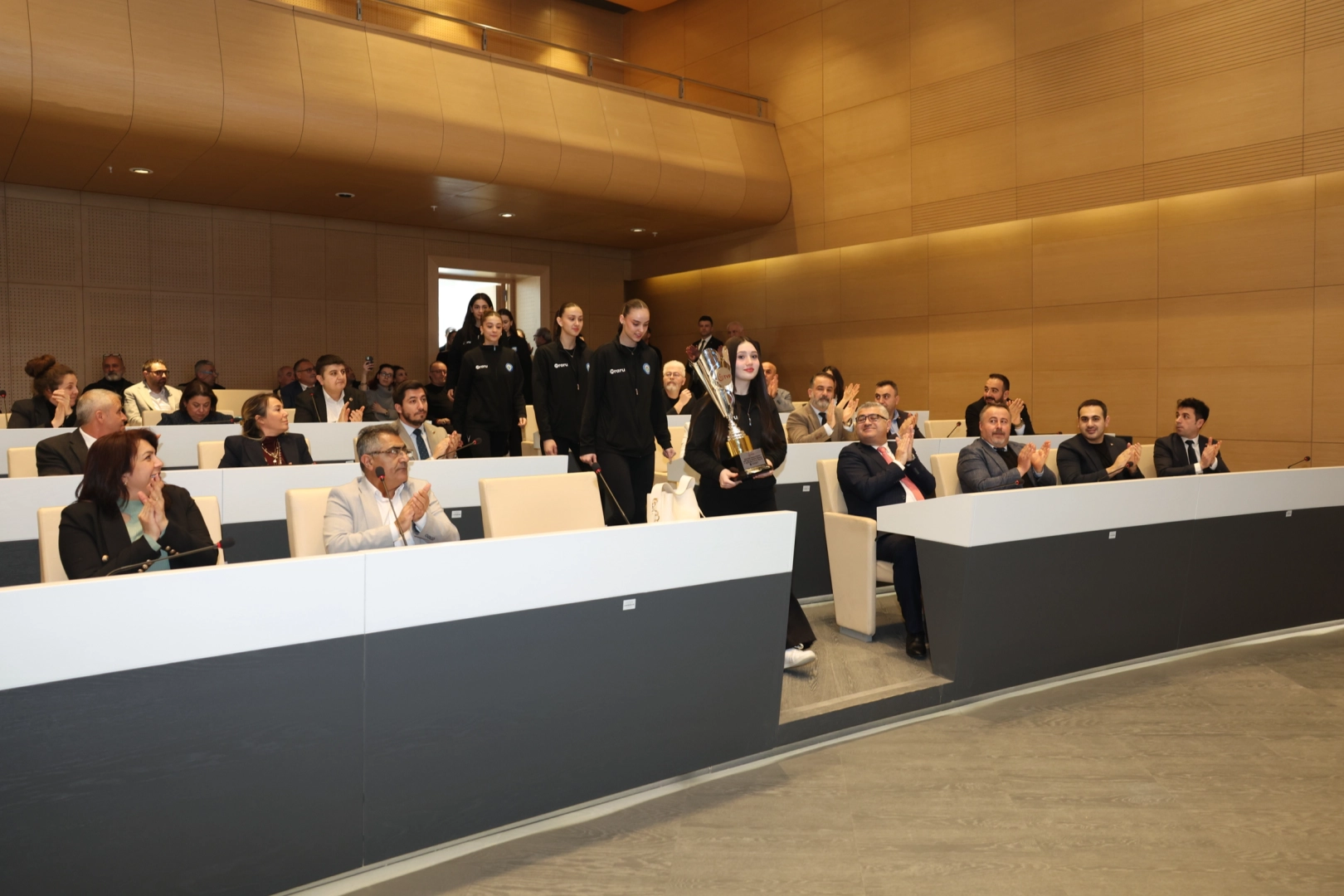 Nilüfer Belediyespor, spor kenti vizyonuna yakışır bir başarıya daha imza attı. 11 ayrı grupta toplam 78 takımın katılımıyla başlayan 2. Lig maratonunda rakiplerini tek tek geride bırakan Nilüfer Belediyespor Kadın Voleybol Takımı, önümüzdeki sezon 1. Lig’de mücadele edecek. Eskişehir’de düzenlenen ve Türkiye’nin en iyi 8 takımının mücadele ettiği final etabında, altyapı disipliniyle yetişen Nilüferli voleybolcular, sergiledikleri yüksek performans ile üst lige çıkma hakkı kazandı. Nilüfer Belediyespor’un yöneticileri, teknik ekip ve genç sporcular, bu başarılarını Nilüfer Barış Meclisi’ne taşıdı. Nilüfer Belediyesi Mart Ayı Olağan Toplantısı’nda başarılarını paylaşan ekip, meclis üyelerinin alkışları eşliğinde salona girdi. Genç sporcular, daha sonra kazandıkları kupayı Başkan Şadi Özdemir’e takdim ettiler. Başkan Şadi Özdemir de kupayı tüm meclis adına teslim aldı. Nilüfer’in altyapı yatırımlarının karşılığını almasından gurur duyduğunu ifade eden Başkan Şadi Özdemir, genç sporcuların 1. Lig’deki mücadelesinin tüm kent için motivasyon kaynağı olacağını söyledi. Bu başarının bir tesadüf olmadığını vurgulayan Başkan Şadi Özdemir, oyuncuların enerjisi, antrenörlerin disiplini ve çabasıyla elde edildiğini kaydetti. Gençlerin kötü alışkanlıklar yerine spora yönelmesinden duyduğu memnuniyeti dile getiren Başkan Şadi Özdemir, sporculara eğitim hayatlarıyla ilgili de önemli tavsiyelerde bulunarak, “İyi bir sporcu olmanın yanı sıra eğitiminizi de başarıyla sürdürmelisiniz” dedi. Takım kaptanı Senanur İbişoğlu ise çok mutlu olduklarını belirterek, “Çok büyük bir hedefimiz vardı, bunu başardık. Destekleriniz için çok teşekkür ediyorum” diye konuştu.