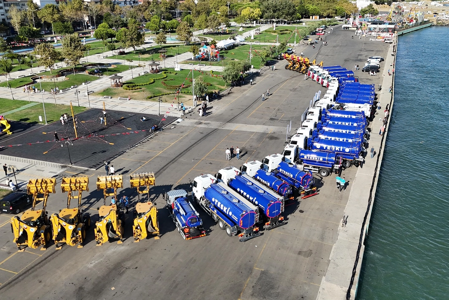 Tekirdağ’ın dört bir yanında vatandaşa daha hızlı ve etkin hizmet sunmak amacıyla çalışmalarını sürdüren Tekirdağ Büyükşehir Belediyesi, araç filosunu güçlendirmeye devam ediyor. Bu kapsamda, 10 vidanjör, 7 kuka (kanal açma aracı), 5 su tankeri, 20 kazıcı-yükleyici (kepçe) ve 1 vaktör tip kombine araç olmak üzere toplam 43 yeni araç TESKİ’nin, 6 kazıcı-yükleyici (kepçe) ise Büyükşehir Belediyesi’nin bünyesine kazandırıldı.