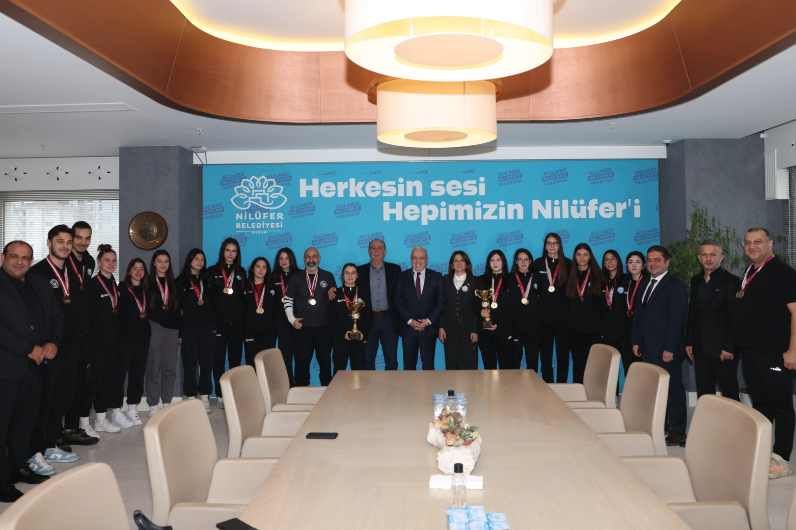 Nilüfer Belediyesi Halk Evi’ndeki başkanlık makamında gerçekleşen ziyarete; Nilüfer Belediyespor Kulübü As Başkanı Mehmet İlker Şener, kulüp yöneticileri, teknik ekip ve şampiyon sporcular katıldı.