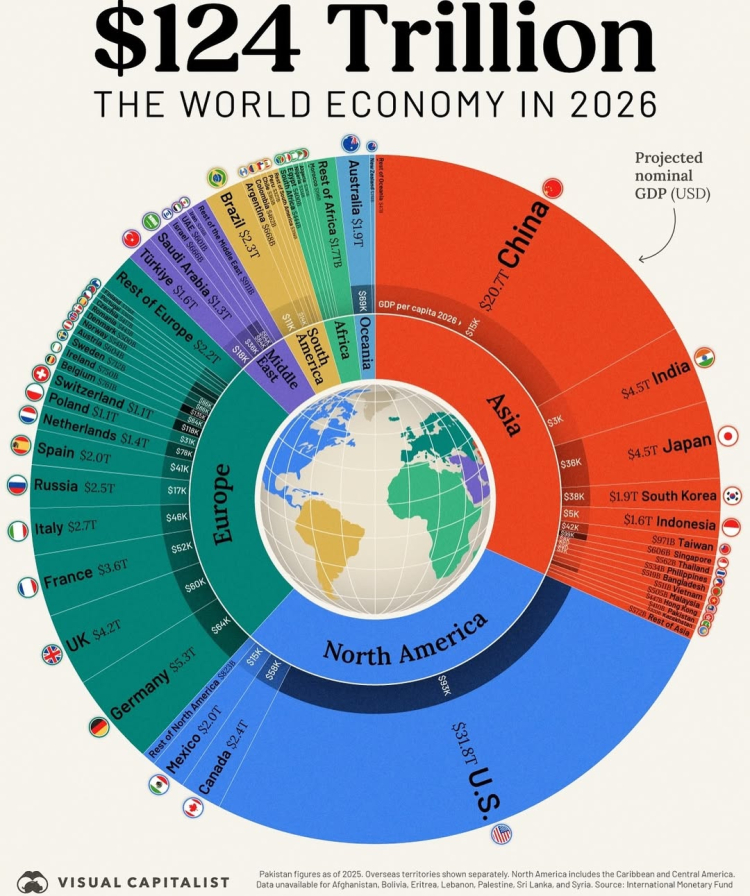 Visual Capitalist tarafından paylaşılan ve 2026 projeksiyonlarını içeren son veriler, küresel pastanın 124 trilyon dolara ulaştığını gösteriyor.